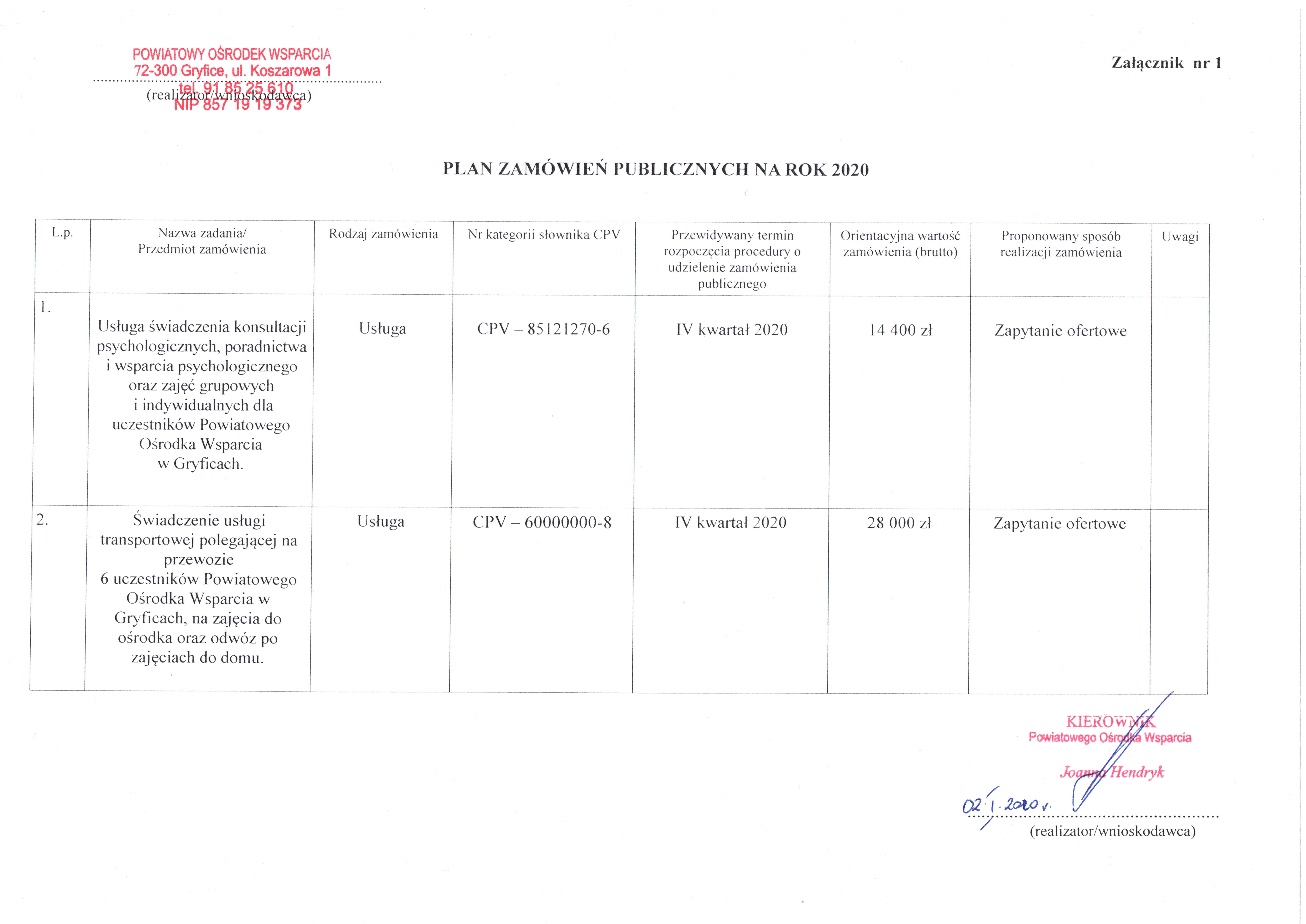 Plan zamówień publicznych na 2020 rok